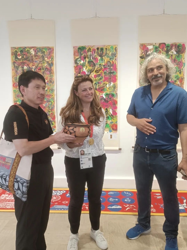 7月25日,在法國巴黎,來(lái)自三門(mén)峽市的王新軍(左)與現代奧林匹克運動(dòng)會(huì )之父顧拜旦的曾孫女黛安·德·納瓦塞爾·德·顧拜旦夫人(中)進(jìn)行文化交流。王新軍作為仰韶彩陶制作技藝的領(lǐng)軍人物,他精心制作了“花開(kāi)奧運”經(jīng)典彩陶盆與廟底溝花瓣紋彩陶盆,參加此次巴黎奧運文化體育交流活動(dòng)。