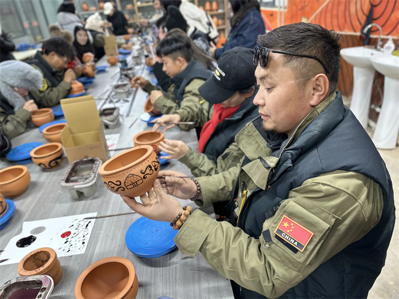 體驗(yàn)區(qū)內(nèi),一場(chǎng)別開(kāi)生面的彩陶彩繪活動(dòng)拉開(kāi)帷幕。駱駝隊(duì)員們?cè)谔账噹熤笇?dǎo)下,將絲路旅途中的見(jiàn)聞凝于筆端——駝隊(duì)剪影與仰韶文化奇妙融合,古老彩陶與異域紋飾交相輝映。