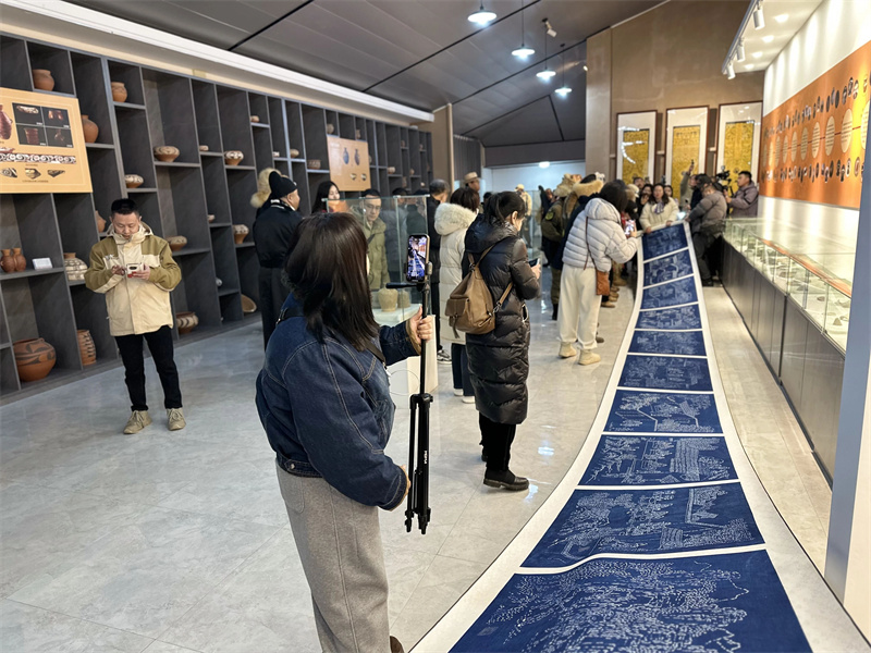 步入彩陶館,駱駝隊(duì)隊(duì)員們被仰韶文化的厚重底蘊(yùn)深深吸引。在公司董事長(zhǎng)暨三門(mén)峽市仰韶文化非遺傳承人王新軍的引領(lǐng)下,他們凝視著館藏彩陶上那些流轉(zhuǎn)千年的紋樣,手撫仿制陶器,驚嘆于七千年前仰韶先民已經(jīng)掌握礦物顏料繪制、高溫?zé)频木抗に?,也被結(jié)合三門(mén)峽特色非遺板藍(lán)根印染技藝的十米仰韶先民生活圖所震撼。